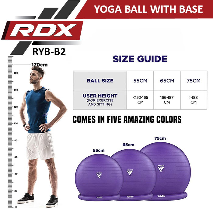 Dale a tus ejercicios un cambio de imagen tan creativo como funcional añadiendo la pelota de fitness con base a tus entrenamientos. Intensifica tus rutinas de calistenia, yoga, cardio e incluso entrenamiento de fuerza con la bola de yoga con base de RDX. Fabricado con PVC de primera calidad antiexplosión para sostener el peso (hasta 250 kg), al tiempo que conserva una suave elasticidad y se desinfla lentamente cuando se pincha en lugar de explotar en pedazos. Resistente al agua y libre de toxinas para proporcionar una experiencia de entrenamiento saludable. El anillo de la base de la pelota de yoga proporciona un excelente control y estabilidad para los ejercicios que requieren un esfuerzo intenso o incluso las posturas relajadas. La base de anillo inflable y desmontable (con un peso de 800 g) permite realizar rutinas sólo con la pelota, incluyendo ejercicios de aeróbic, yoga y con pelota de fisioterapia. La superficie suave y antideslizante, con un patrón de lÃneas antideslizantes de 360°, ofrece un agarre superior para evitar el deslizamiento indeseado de la pelota de gimnasia. Es la bola de fitness ideal para el gimnasio en casa para realizar ejercicios de todo el cuerpo, mejorar el equilibrio y aliviar el dolor. Se recomienda su uso durante el embarazo, ya que proporciona una superficie de asiento cómoda para corregir la postura y aliviar la presión de la columna vertebral. Ideal para los ejercicios de preparación al parto.