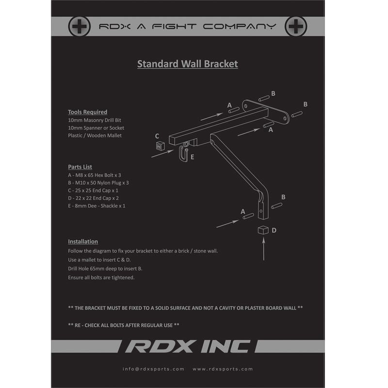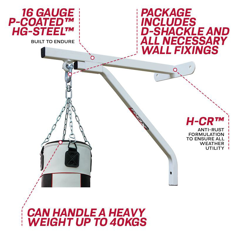 Compact and heavy-duty. RDX®s welded 16 gauge P-Coated HG-Steel is sturdy, and built to endure. Treated with H-CR anti-rust formulation, this all weather wall bracket can hold bags up to 40 KGS on attached D-Shackle at the end of 42CM (away from wall) heavy-duty arm. Assembly instructions and all necessary wall fixings are including. This bracket sets the standard for all-around seasonal training.